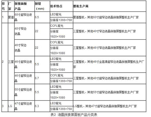 对于市面上各大品牌的液晶拼接屏整机产品,它们的核心部件液晶面板来源可以按照厂家和尺寸进行分类,具体分类如表2所示。