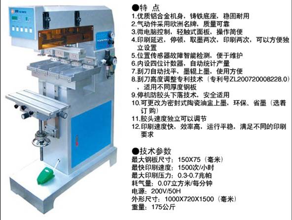 产品包括移印机32款、丝印机14款、烫印机7款、热转印机8款、全自动印刷设备1款、周边设备4款。公司还配套生产各种移印胶头、移印刮刀、移印钢板以及热转印花膜。并代理国际优质品牌德国迪高(RUCO)系列移印丝印油墨、UV光固丝印油墨、UV柯式干平版油墨、镜面油墨、UV固化柔版油墨、UV丝印 刮刮乐固化油墨。公司备有专门技术咨询服务中心、人员培训中心和售后服务中心。