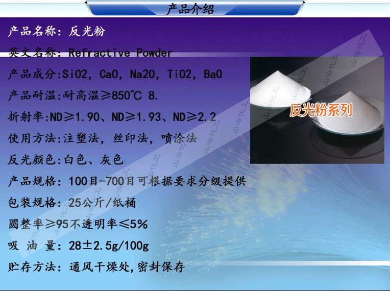 反光粉是由一种玻璃微珠粉体材料生产而成,分为三种折射率,即:ND≥1.90、ND≥1.93、ND≥2.2规格从200目—500目可分级提供,颜色有灰色及白色供选择。