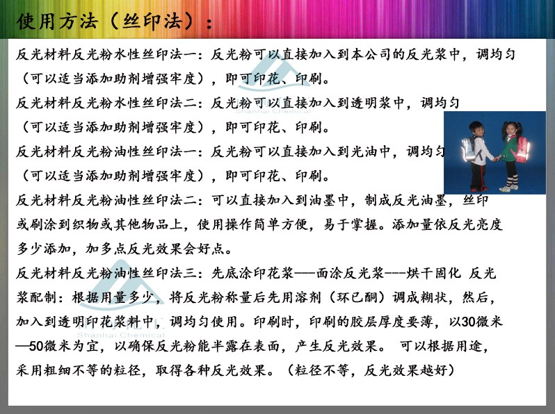 反光粉是生产反光布、反光革、反光贴膜、反光涂料等新型发光功能复合材料的核心元件,是反光织物、反光涂料、化工涂料、广告宣传材料、服饰材料、反光膜、反光布、反光标牌标识、机场跑道、鞋帽、书包、水陆空救生用品、夜间活动人员穿着等产品的必需材料。它具有回归反光的特性并由此产生较强的回归反射效应,无需外加电源,可广泛用于道路、港口、矿山,消防等领域,作为安全标志,大大地提高了使用者的安全可靠性。