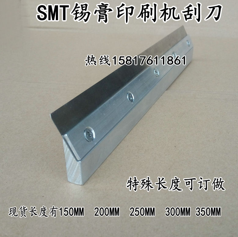 SMT锡膏刮刀产品特点: 本产品配合印刷机印刷锡膏或贴片胶,通过钢网将锡膏或贴片胶漏到PCB上。钢片材质:不易变形,弹性好,耐用产品规格:50MM、100MM、150MM ,200MM, 250MM,300MM,350mm 400mm 450mm 500mm长度不限可按照客户要求制作!