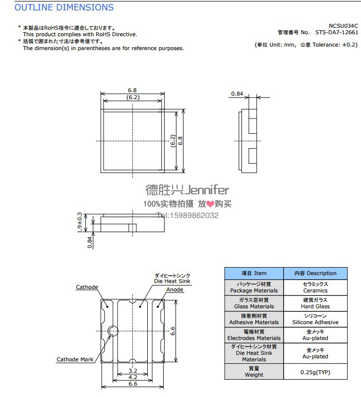 封装尺寸:6868 6.8*6.8*1.9 L*W*H(mm)