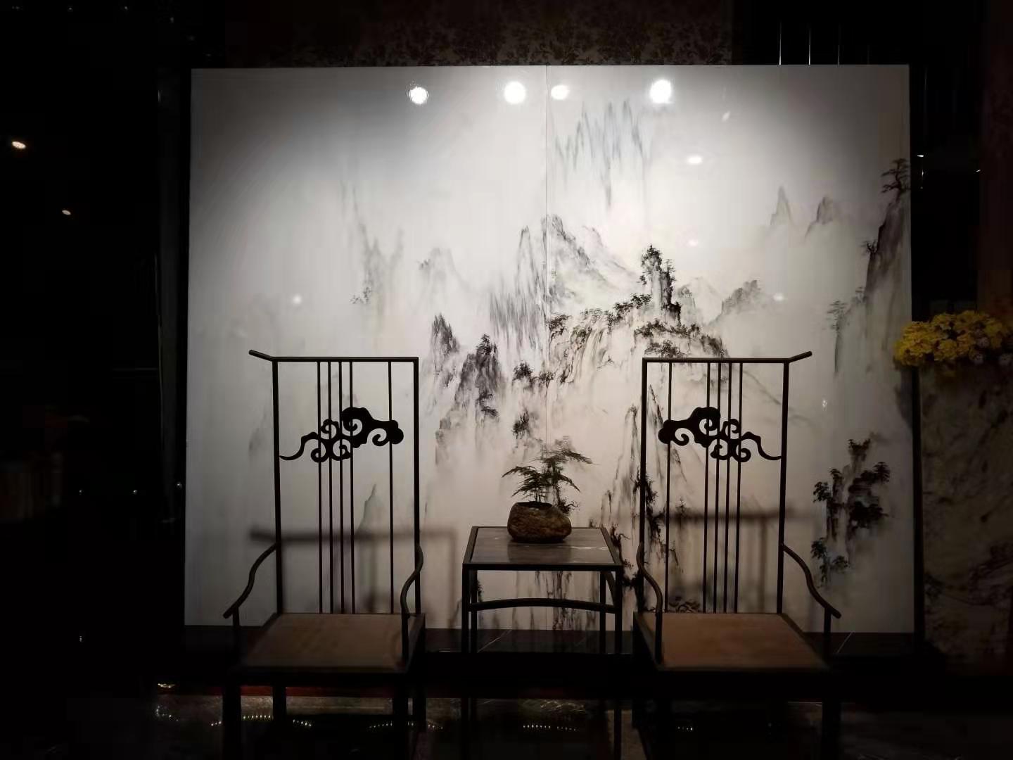 瓷艺背景渗墨大板背景是以传统的岗石胚体为主 ,在产品纹理的成型上采取渗花墨水渗透下陷工艺生产的新型大板背景。渗墨大板在进行喷墨工艺后,渗花墨水渗透下陷进入砖体,进窑炉两千多度高温烧成后再进行抛光工艺,甚至可以做到透光的效果,还更好地解决了传统瓷砖背景墙缝隙明显问题。 加工制作方便。