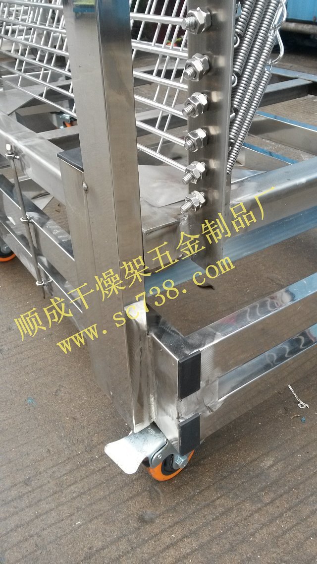2、按照您提供的干燥架整体外形尺寸规格,网片尺寸及应用线材,网格大小,网片层距,主架脚轮,网片工艺,主架工艺,总网层数,支点